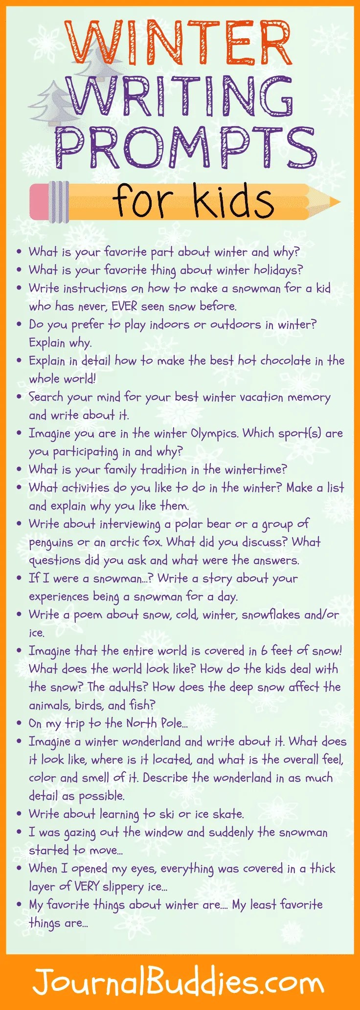 Take a look at these winter writing prompts perfect for upper elementary . Are you looking for ways to practice writing during winter? Make writing fun with winter story starters. On a dark and stormy night · 4. If people hibernated like bears… · 2.